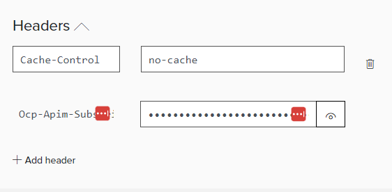 Now we are ready to configure some small settings in order to request data. The only thing you need to configure is the Ocp-Apim-Subscription-Key - the subscription can be located from the online test tool under the API itself - just hit the reveal icon and the dots will showcase the API subscription key. It's also possible to locate your Ocp-Apim-Subscription-Key from within you profile page - here it is possible to choose the primary or secondary key, and both works.